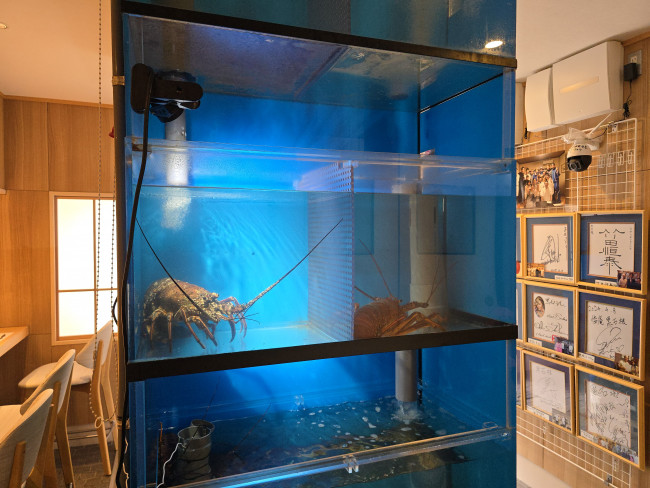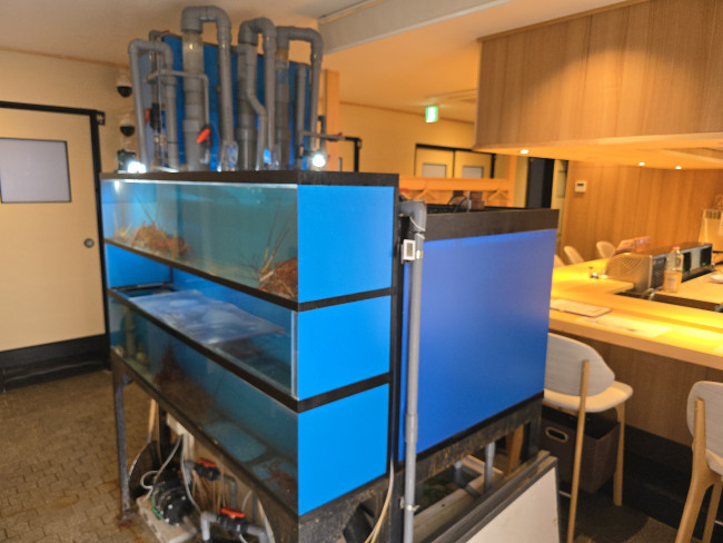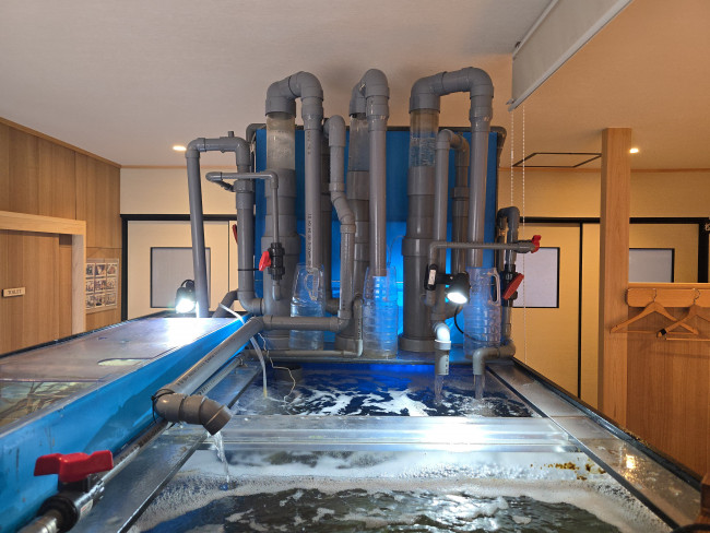 今日は海水のお話し。伊勢海老やあわび、魚を保存するためには水槽設備一式(水槽・循環ポンプ・エアーポンプ・エアーストーン・冷却装置・ろ過槽・サンゴ・プロテインスキマーなど)と海水が必要です。ちなみに45年前、伊勢市で一番最初に活魚水槽を導入したのは父が初めてで、のちに他の料理屋さん達に設備や魚の飼い方のノウハウを伝授してあげたそうです。水槽を完備して、うどん屋から活魚割烹すし店にリニユーアルした開店初日に、前日に買い込んだ鯛が全滅していたというエピソードは笑い話。小さい水槽に鯛をたくさん入れ過ぎたことによる酸素不足が原因でした。父も色々な失敗を乗り越えてきました、今まさに私が色んな失敗や経験を積んでいる所です。父は得意分野でしたが、私は一番苦手な分野で、日々苦しんでいる毎日です。(笑) それと一番重要なのが、海水の管理です。伊勢海老や魚が品質の悪い海水で活かされていたら、どれだけ強くて美味しくても、死んだり、不味くなってしまいます。人でも良い空気環境と悪い空気環境を吸って生きることでは全然違うと思います。生き物も同じです。そのために良い環境(海水)で育てることが最も重要なのです。海水の品質は、海老や魚の糞や、死骸によって悪くなりますが、一般的にはサンゴを入れた濾過槽でによって、ろ過して浄化させます。(人間社会では、浄化槽や下水道にあたります)それにプラスして、より良い海水にするための装置がこのプロテインスキマーです。市場や水産業者さんの中でも導入されている所はほとんどないと思います。高価であること、知識がない事、良い品質作りを求めていない事などが理由と思われます。プロテインスキマーは、泡を立たせることで汚れを除去させます。簡単に説明すると濾過槽は、汚れた細菌の分解後を浄化させるもので、スキマーは分解前を浄化させるものです。このW効果によって、最高の環境状態で活かされた伊勢海老やあわび、魚をお客様にお届けしています!