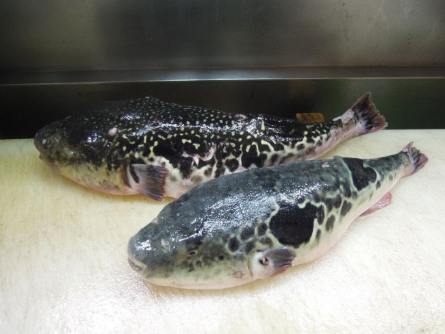 木曜日に使う”天然とらふぐ”を仕込みました。 養殖ものとは、皮の色が違います。 黒光りしています!