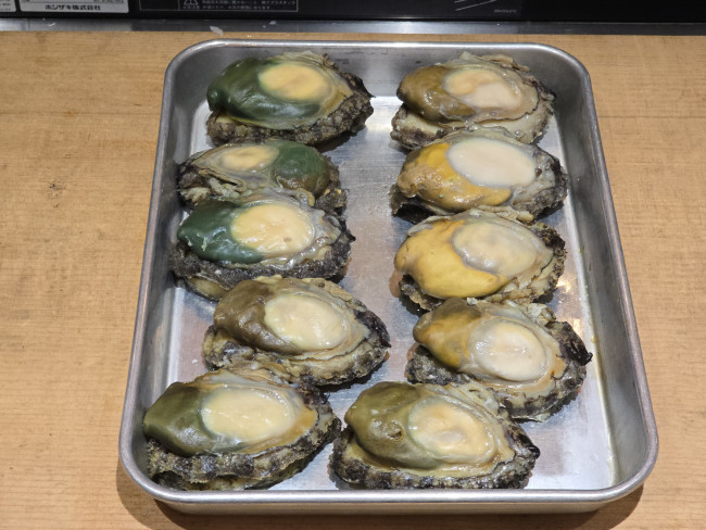 つがいアワビの仕込みです。肝の色でオスとメスを見分けます。明るい色がオスで、暗い色がメスになります。伊勢志摩の風習で、妊婦さんがアワビのつがいを食べると、大きな瞳の元気な赤ちゃんが生まれる言われています。