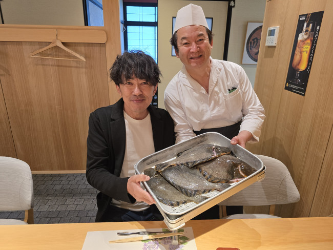 ラウスのまゆが送ってくれたマツカワカレイを藤本さんにプレゼント!今日も実り多き一日となりますように! あと4日間だよ~