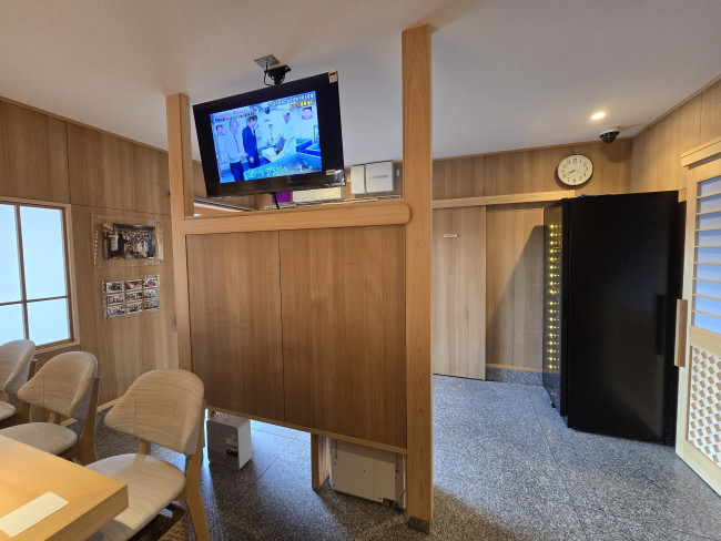 テレビを設置しました。過去のテレビ出演放送や、お店のプロモーション映像を流します。