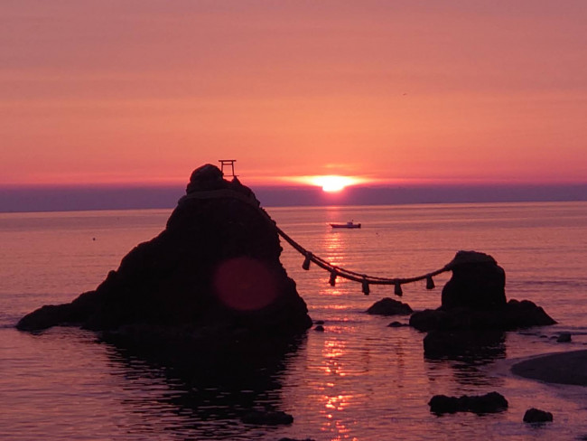 夏至の前後一週間だけ、二見ヶ浦の夫婦岩の間に日の出が見れます。