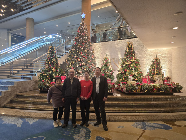 こちら偶然に撮った一枚の写真と思いきや、ツリーの先とホテルの中心の灯りが一直線に。