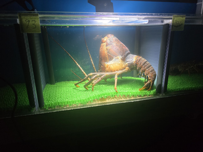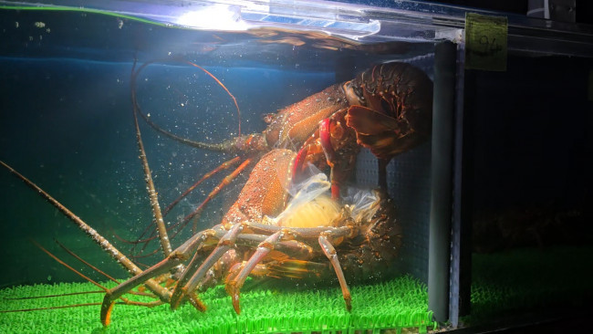 1キロアップのメガ伊勢海老の脱皮前をモニターで確認!
